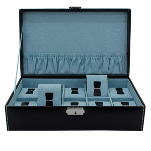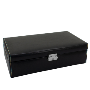 Rannekellon kerääjälle säilytyslaatikko - 10 kelloa sopii Päällinen käsintehty nahka, sisäpuoli hienoa synteettistä materiaalia. Rasian saa lukittua. Tyynyt: 50 x 70 x 30 mm Koko (W x D x H): 300 x 175 x 85 mm Paino: 1040 g